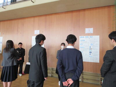 1月15日(木)5~7限、2年生がRQ型課題解決の中間発表会に臨みました。体育館では34ブースに分かれてポスター発表を行い、スタディホールでは17ブースに分かれて外部講師(NPO法人みんなのおうえん団20名の皆様)による指導助言を受けました。